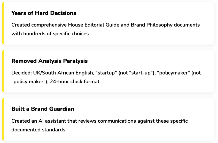 The Brand Guardian AI wasn't evaluating whether the writing was "good" in some universal sense. It was measuring alignment with their specific standards.