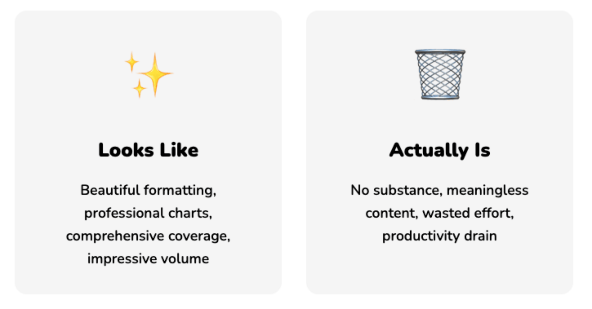 It's the AI-generated report that looks professional but contains no real insight. It's the comprehensive email that says nothing actionable. It's the presentation deck that uses all the right buzzwords but provides no clarity.